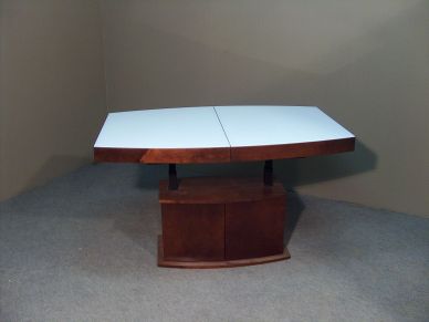 Zem galdiņa iebūvēts “BĀRIŅŠ” ar masīvkoka un finiera durvīm, glāzēm un alkoholiskiem vai bezalkoholiskiem dzērieniem.