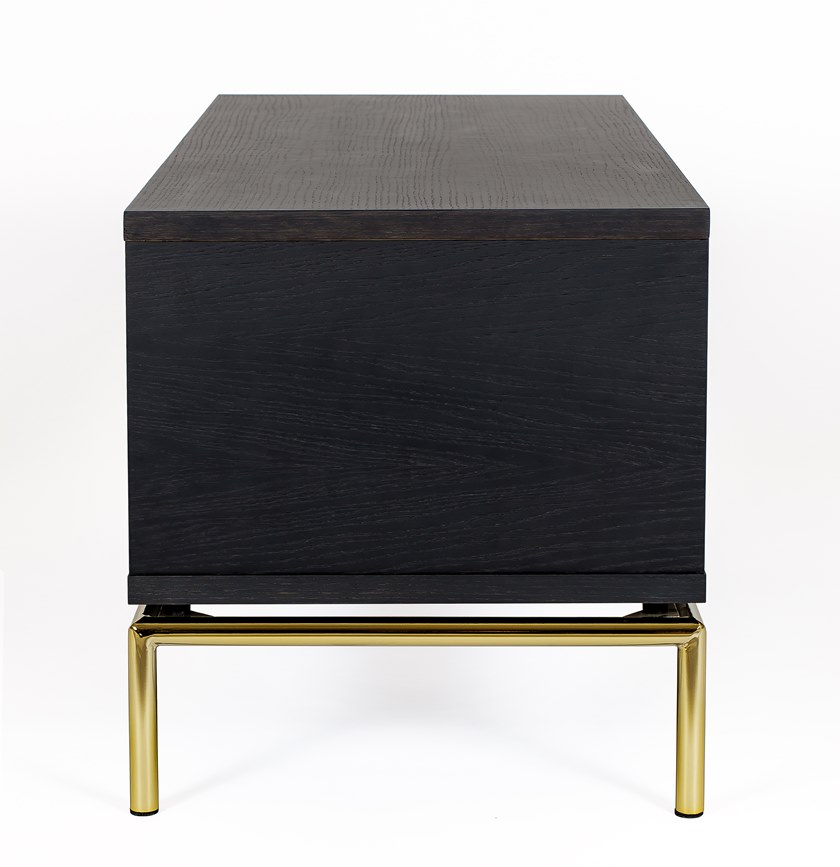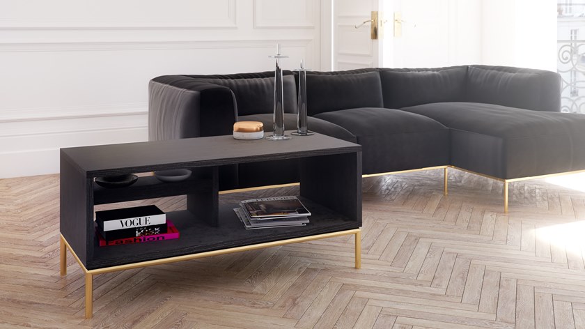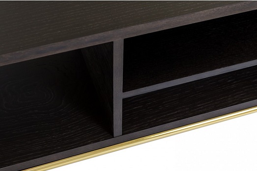 Papildiniet savu dzīvojamo istabu vai uzgaidāmo telpu ar šo eleganto kafijas galdiņu ar tumša koka un misiņa detaļām un praktiskiem plauktiem lietu novietošanai. Spīdīgas misiņa krāsas kājas piešķir žurnālgaldiņam greznu izskatu. Melnā ozola finiera galds nešaubīgi piesaista uzmanību.