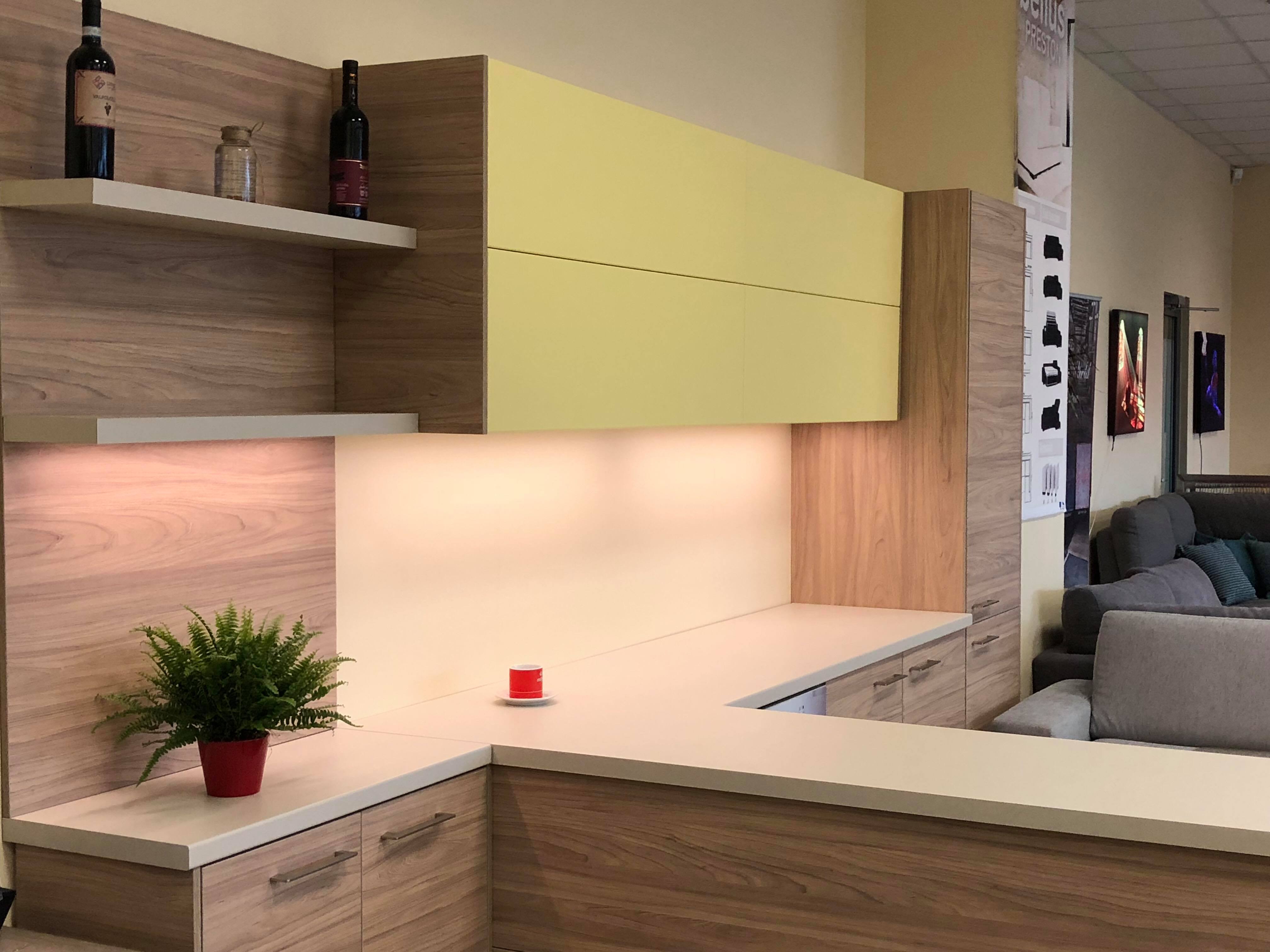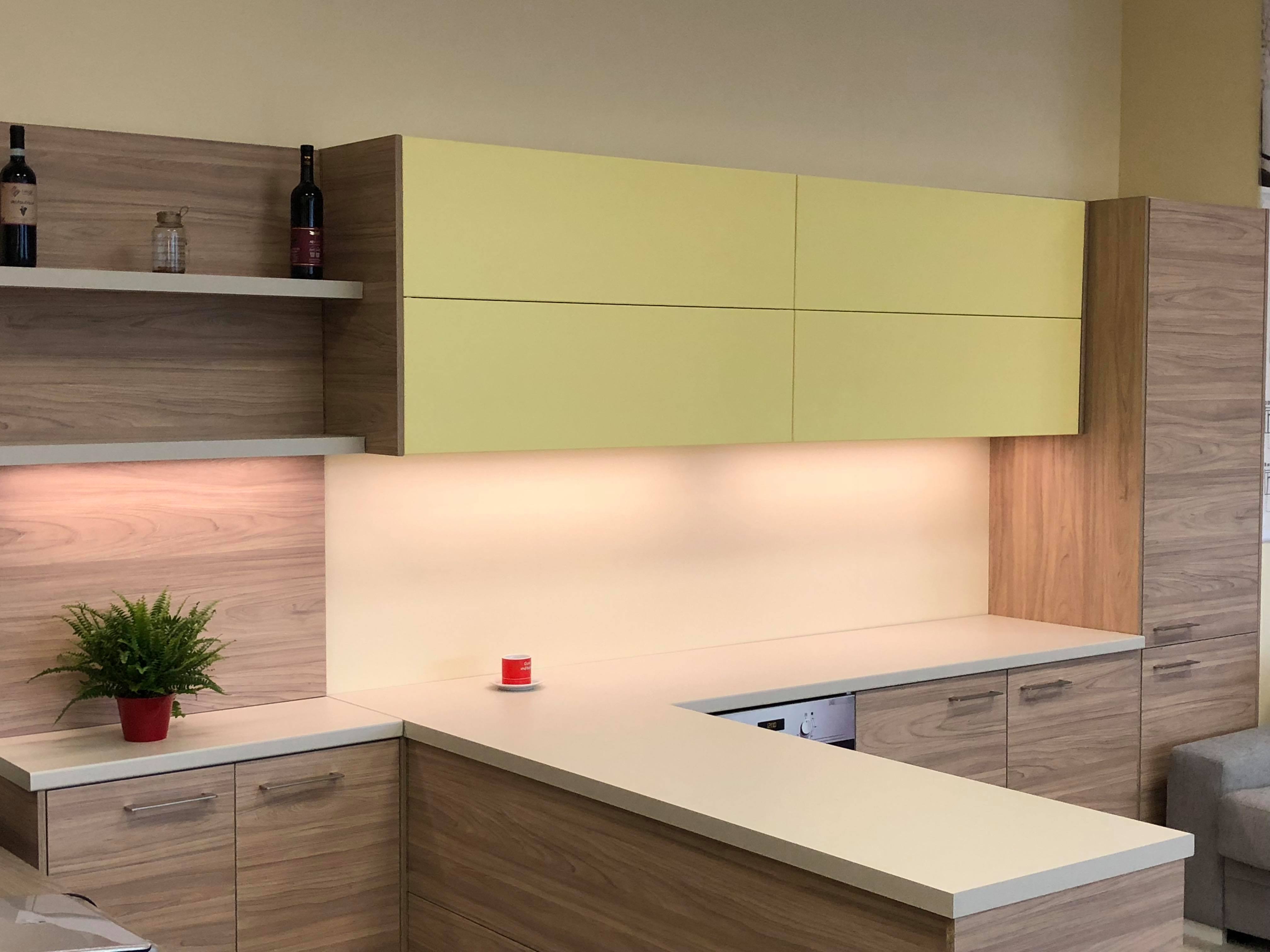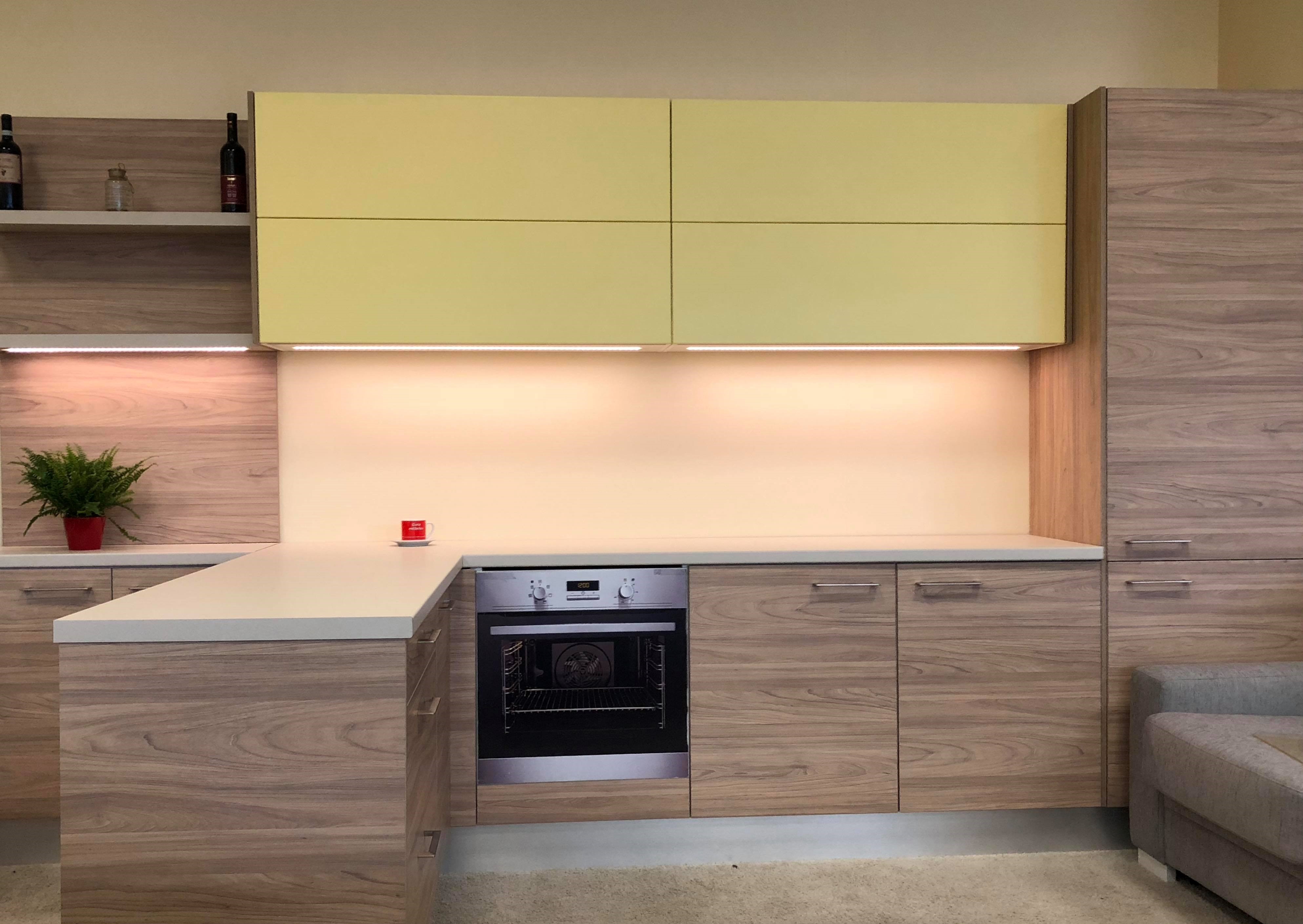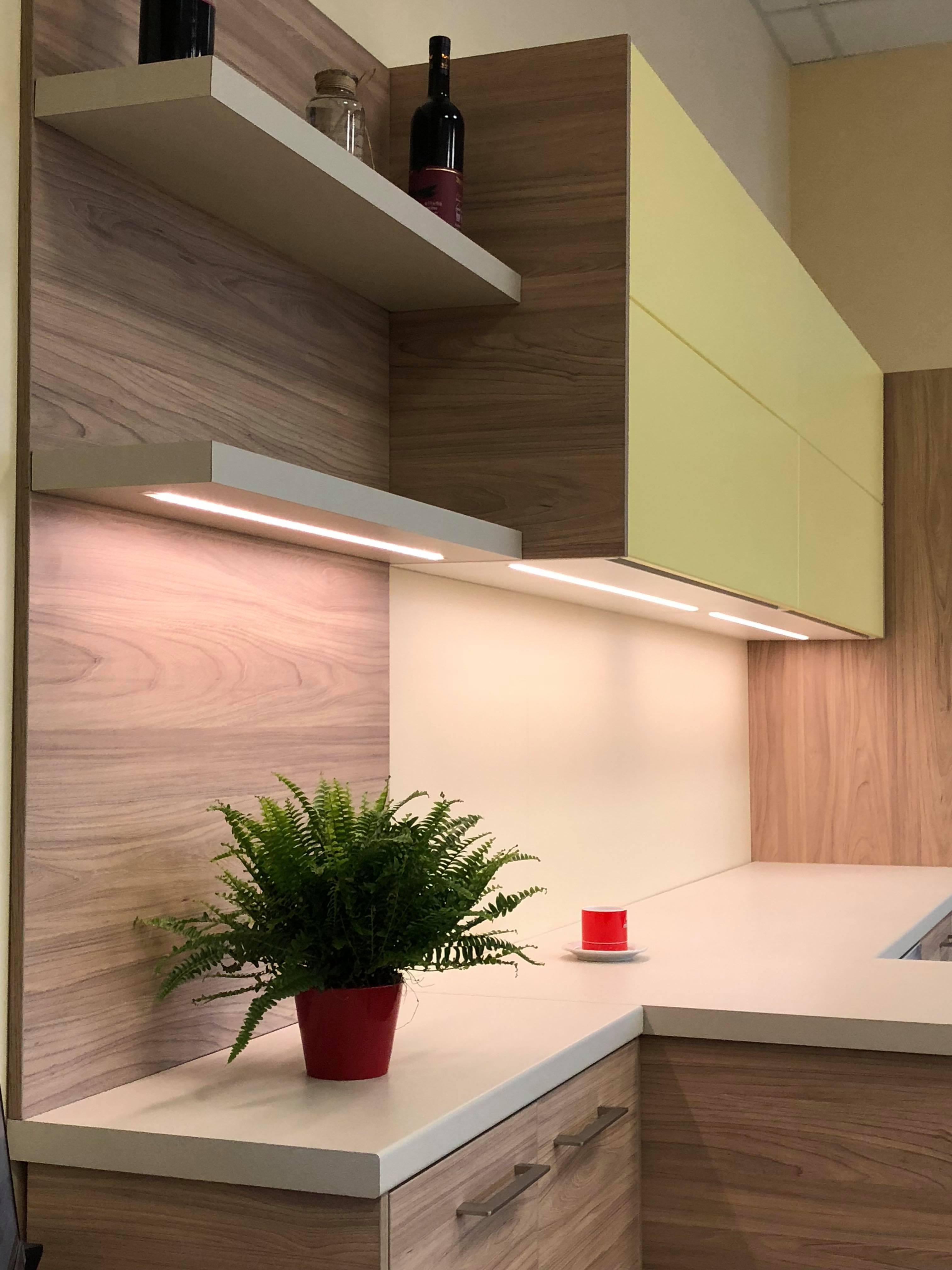 Augšējos skapīšos ir izmantotas krāsotās MDF fasādes ar iestrādātiem LED apgaismojumiem, kuru ieslēdz ar kustības sensoru.